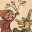 煮饭去了:在农舍将蘑菇交给巫婆,趁她进屋煮饭的间隙拿走扫把