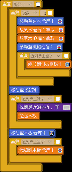 多数人应该会选择拿一次原木,然后再捡一次木板木板送进去。这里加快的方法是选择拿两次原木,再捡一次木板。因为我的机器人是2级机器人,单次可以运输两条原木,在力量升级的情况下有8格手部空间,所以拿两次原木正好可以生产出8条木板来,这样减少了一次往架子送木板的过程,使得其更快。