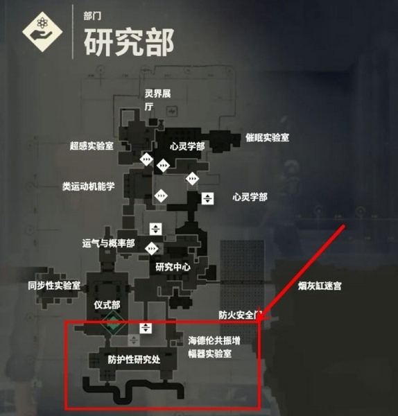 想要进入【橡皮鸭】所在的区域首先需要进入【研究部 防护性研究处】,先来到【海德伦共振增幅器实验室】南侧的入口。