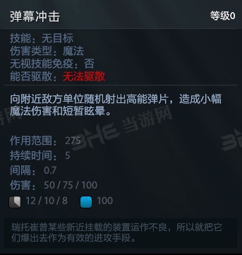 而在《刀塔自走棋》中只保留一个技能就是弹幕冲击,向发条身边的敌人随机射出弹幕,造成50/75/100的小幅法伤以及短暂眩晕,可以用来打断敌人释放技能。总体来见,在自走棋这样英雄自动进攻的游戏中,只保留这弹幕冲击一个技能还是不错的,照明**和钩爪其实都是灵活预判技能,自走棋中自然不会留下,而齿轮可能会弹开自己的英雄。