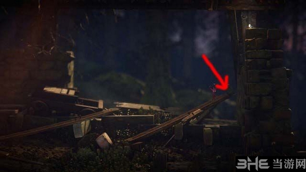 先使用钩锁将如下图箭头所指的砖头弄下来,之后砖头会将下面的地板砸碎。
