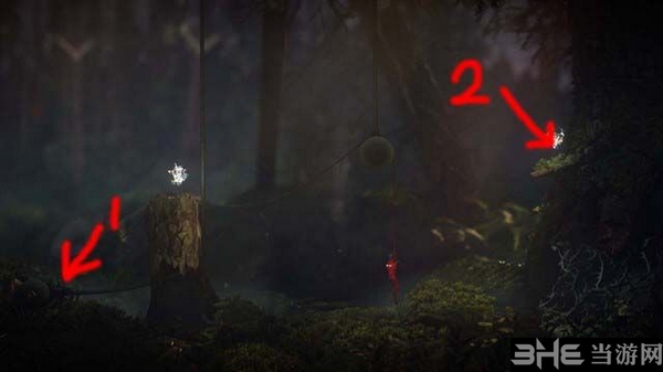 另一个精灵就在下面把滑轮1往左边推,之后滑轮2处的精灵(笔者这里使用的是蓝色精灵)再荡到左边的树干上,