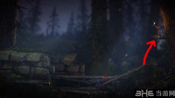 然后木板就会往右边翘,另一个精灵再顺着如下图箭头所示的路径上去。