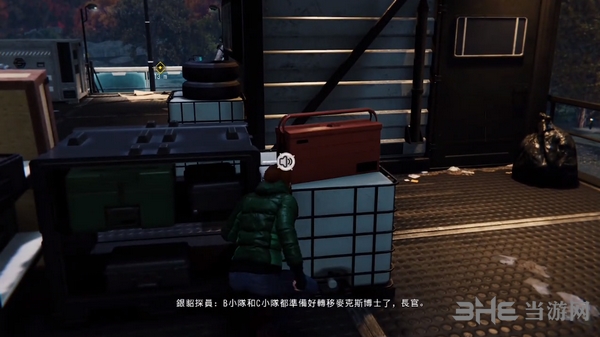 穿过帐篷往前走,推掉红色箱子引开守卫,再通过旁边的集装箱,沿着帐篷走到下个楼梯口。