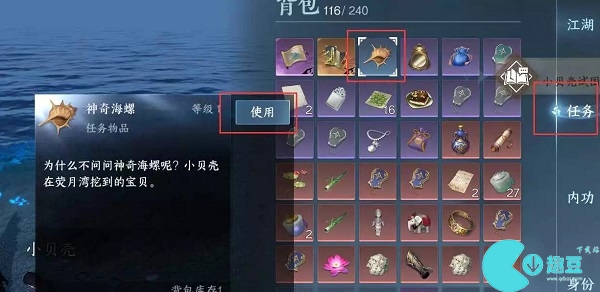 3、**打开背包-任务中使用“神奇海螺”道具,之后继续进行对话就可以完成任务了。