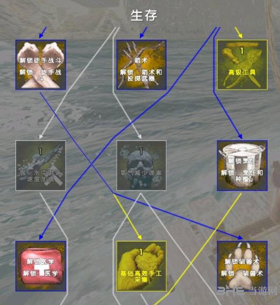 生存可解锁建筑(解锁2点)、徒手战斗(解锁2点)、箭术(解锁2点)、烹饪(解锁3点)、医学(解锁3点)、驯兽术(解锁3点),以及工具,游泳速度、氧气减少速率、水中温度加成、**维生素消耗、提高手工采集速率。