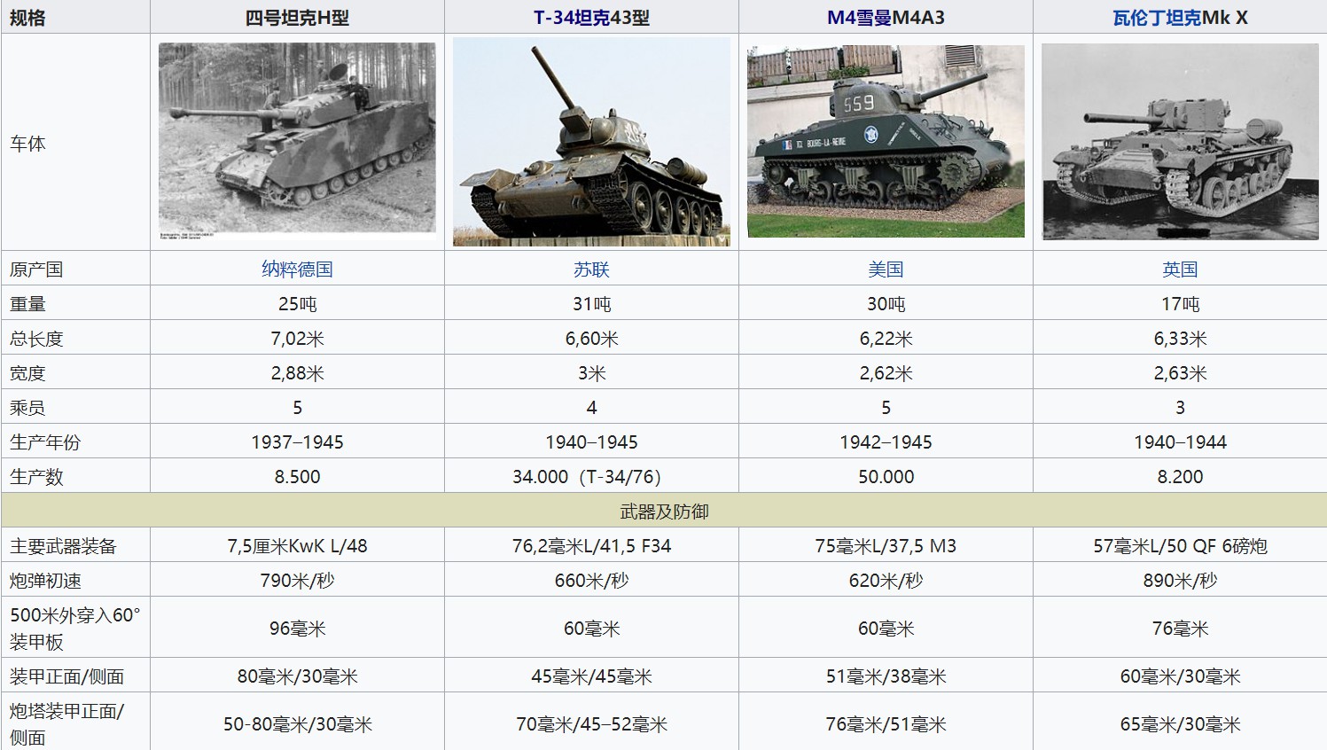 下面再附一张**百科的1943年各国主力坦克对比图。
