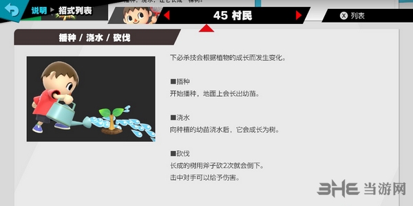 村民的普通必杀技是收起/取出,可以把道具和对手的飞行道具手进口袋。再次按必杀键的话,就可以将收进的物品取出。