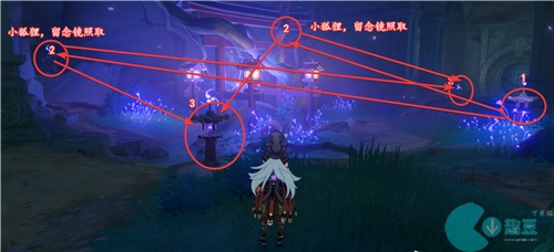 和五百藏复命,获得镇物,再去结界处,按照下图所示的顺序,破除结界即可。