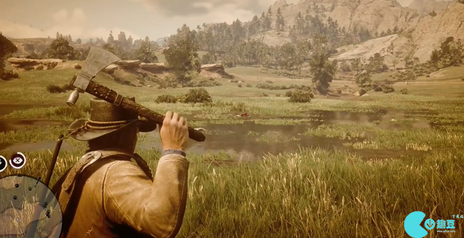 3、看到牛仔在对面后,我们先用枪指着牛仔,直到标示变红后,将武器切换为手斧并使用死眼标记骑马的牛仔头部,将其击杀。
