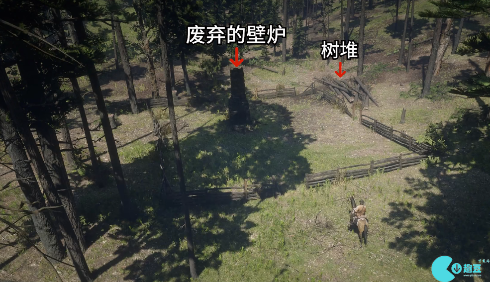6、到达目的地后可以看到地上有一个废弃的壁炉和一些树堆,之后我们原地存档并读档。