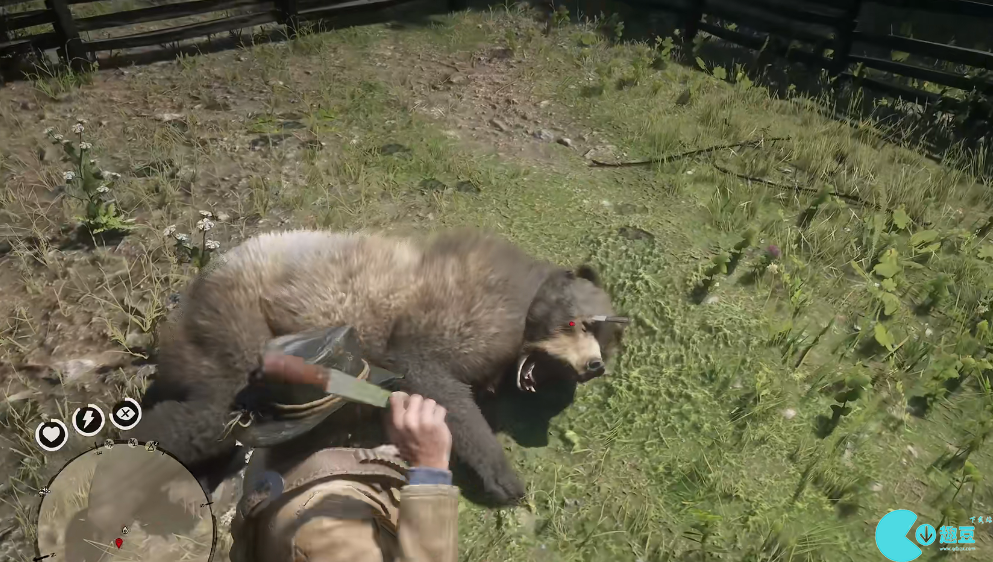 9、原地等待10秒左右后,灰熊就会出现在旁边我们使用死眼标记灰熊,然后使用淬毒飞刀将其击倒,击倒后依然是拿出普通飞刀补刀将其击杀就可以完成本挑战。