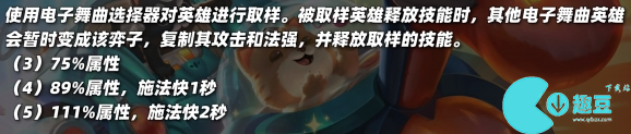 使用电子舞曲选择器可以对英雄进行取样。当被取样的英雄释放技能时,其他电子舞曲英雄会暂时变身成为该英雄,复制其攻击力和技能威力,并释放取样英雄的技能。
