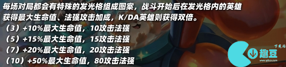 在每场对局开始时,将会生成一个特殊的发光格图案,战斗开始后,位于发光格中的英雄将获得额外的**生命值和法术强度的增益,使他们更强大。而对于K/DA英雄来说将获得双倍。