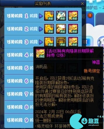 阶段奖励中可以获得8张稀有克隆装扮期限解除券,可以将赛丽亚的特别商店中的期限稀有装扮升为**稀有装扮。