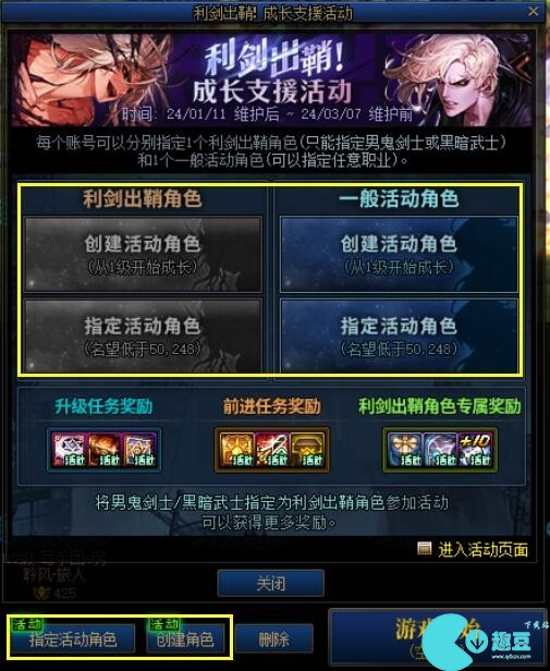在活动时间内,玩家在角色选择页面绑定成长支援活动角色,既可以创建新角色作为活动角色,也可以将已创建且名望低于50248的角色作为活动角色。
