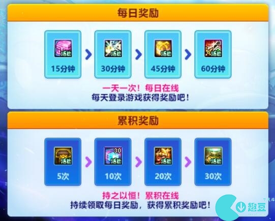 在活动期间内,玩家每天累积在线达到15/30/45/60分钟可以获得对应奖励,当领取60分钟在线奖励的次数累积至5/10/20/30次时还会获得额外奖励。