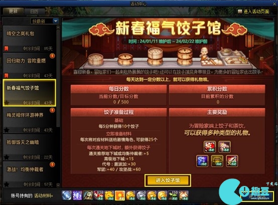 在活动时间内,玩家可以通过活动**页面也赛丽亚房间活动NPC进入小游戏,根据小游戏成绩可获得饺子馆红包奖励,饺子馆红包可以在NPC商店中兑换各类奖励。