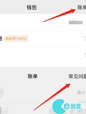 2、接着我们在钱包页面点击右上角的账单,在账单页面点击右上角的【常见问题】;